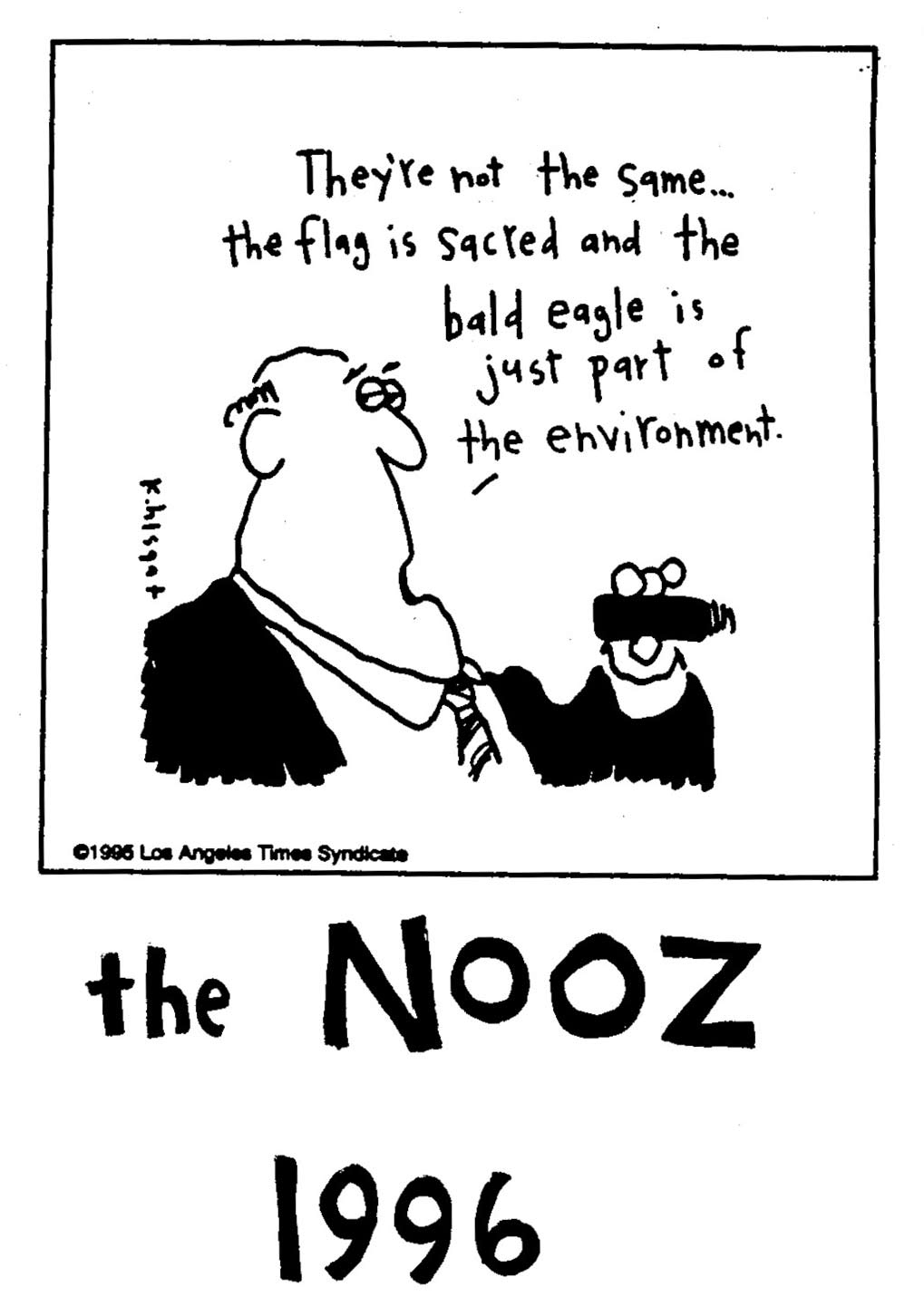 These cartoons are from a 1996 promo calendar. The NOOZ was reluctantly published and distributed by the Los Angeles Times Syndicate via the iconoclastic Modern Times Syndicate. Put these in just to demonstrate how little things really change.