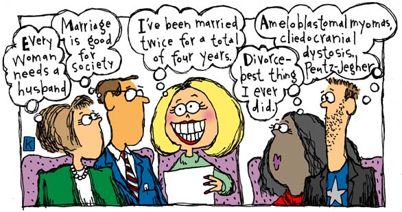 It seemed that the producer of a new afternoon television talk show--dubbed "Men Are From Mars, Women Are From Venus," in a nod to the self-help relationship book of the same name--happened to have seen in the Los Angeles Times one of my syndicated cartoons, a single panel called Single Slices. Apparently, she thought I would make a perfect guest panelist for an upcoming show. The topic, "Who Needs A Husband, Anyway," was inspired by the recent Time magazine cover story, "Flying Solo-Single Women and Their New Status." Success in the cartooning business, as in most endeavors, often requires a large amount of dumb luck. In this case an invitation to appear on television had simply dropped in my lap. It's hard to ignore such divinity. Would such an occurrence jump-start my cartooning career? Doubtful. Never the less, without seeming overtly spiritual, I did feel a certain amount of karma here. And the irony wasn't lost on me: just as I'm about to make a monumental career change, something comes along to attempting to possibly dissuade me.